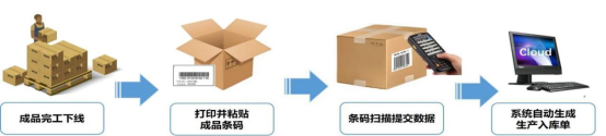 成品完工下線時,將成品條碼打印并粘貼到包裝上,倉庫人員先掃描生產(chǎn)訂單,并逐一掃描成品條碼,系統(tǒng)自動關聯(lián)生產(chǎn)匯報單生成產(chǎn)品入庫單。