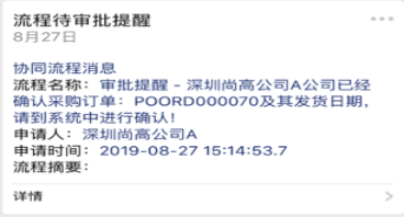啟用采購協(xié)同管理的供應商通過微信接收到同步的采購訂單信息后,對所屬的采購訂單確認后進行發(fā)貨。全程高效協(xié)同,實現(xiàn)有計劃的集中采購(微信端接收信息與處理)。